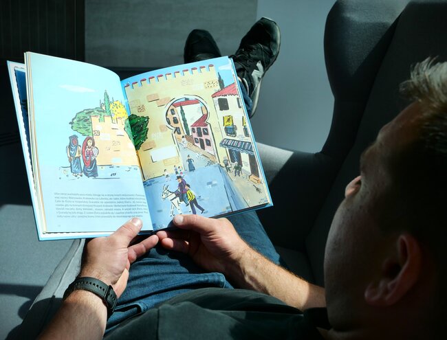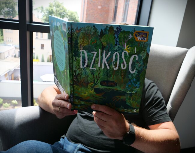 ,,Tato, wuju, dziadku, Trenerze! Masz super moc, o której być może nie wiesz. Jesteś dla dziecka przykładem i wzorem. Ważnym źródłem postaw, zachowań i nawyków. Także, a może przede wszystkim, czytelniczych. Czytaj więc z dzieckiem! Czytanie ma moc budowania relacji. Czytać na głos dziecku można nawet, kiedy jest w brzuchu matki. To świetny sposób na oswojenie go z głosem opiekuna. Odkryj moc książek i swoją własną!’’