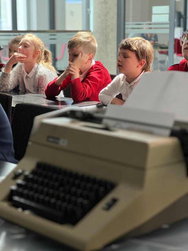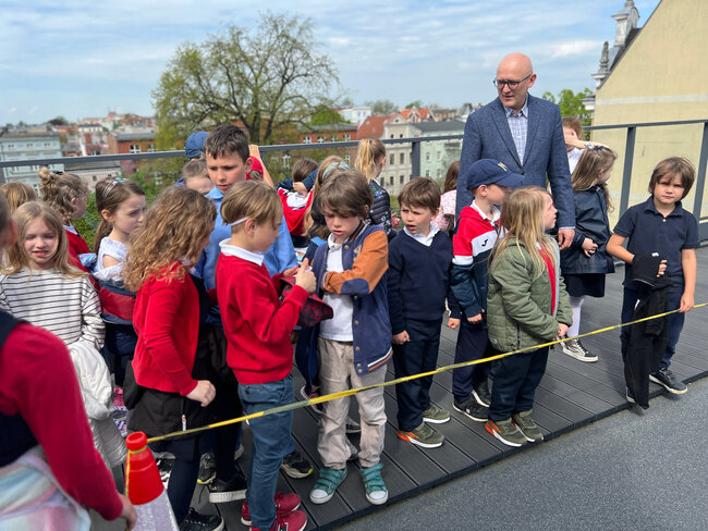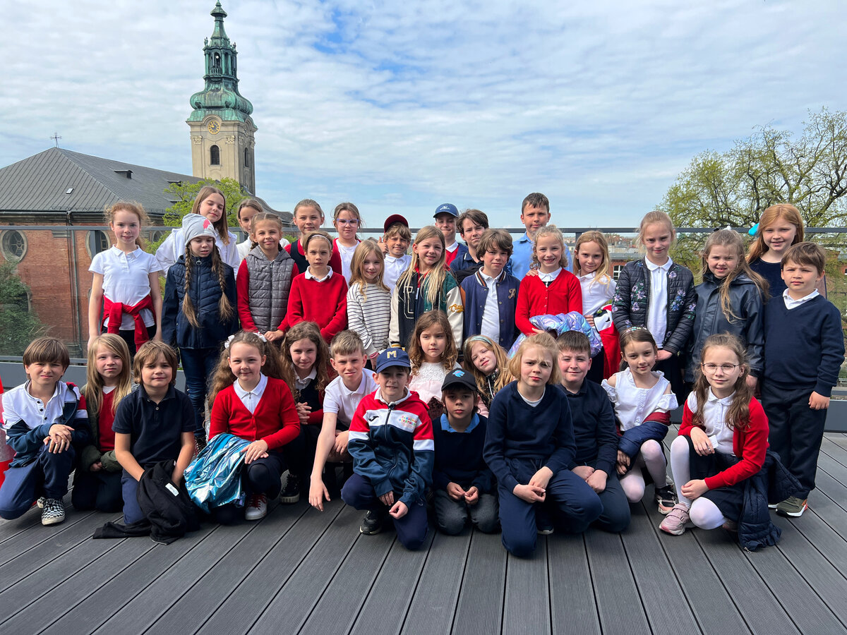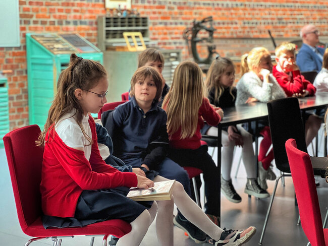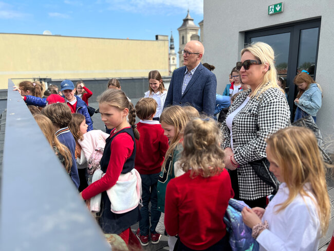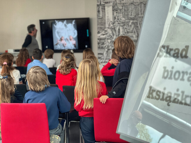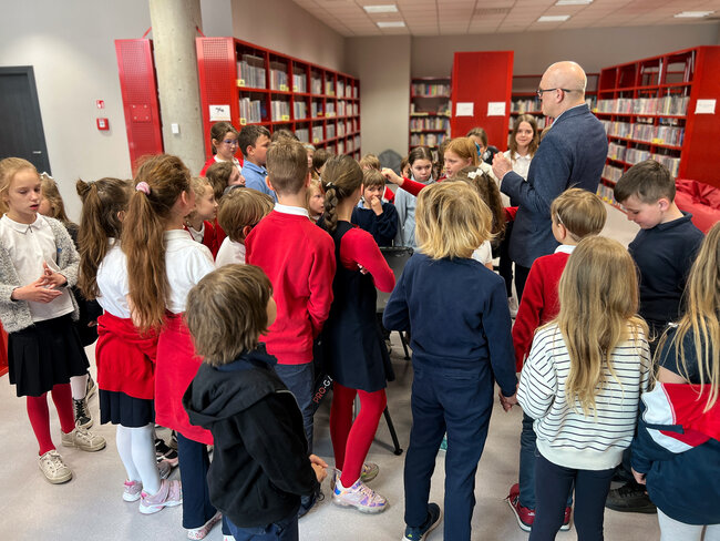 Po bibliotece oprowadzał ich Paweł z Działu Edukacji, który z pasją opowiadał o funkcjach, jakie pełni nasza placówka. Dzieci odwiedziły Czytelnię Muzyczną, Wypożyczalnie książek, Czytelnię Naukową, a także Muzeum Drukarstwa, w którym dowiedziały się m.in., co można zrobić z papieru i jakie mamy rodzaje pisma. Wycieczka obejmowała także wyprawę na taras, gdzie zapozowaliśmy do pamiątkowego zdjęcia. Dzieci zgodnie przyznały, że chętnie wrócą do biblioteki, bo przekonały się dzisiaj, że to naprawdę fajne miejsce.
