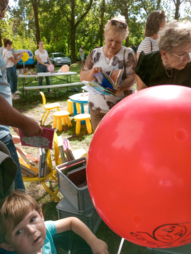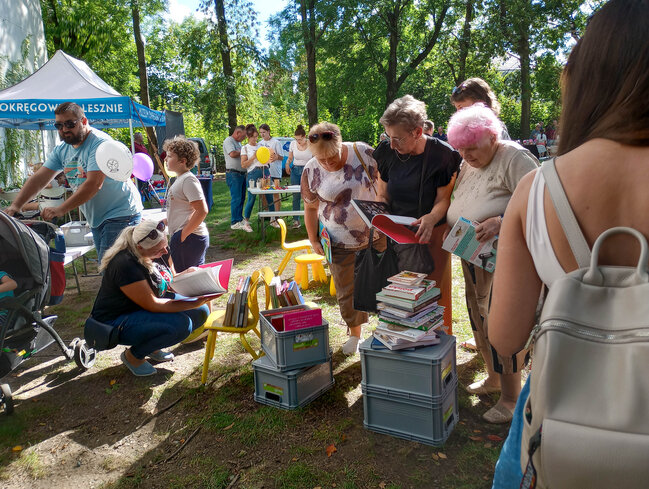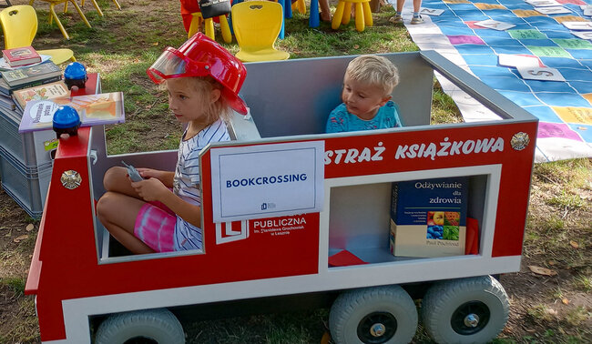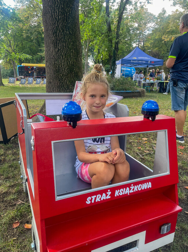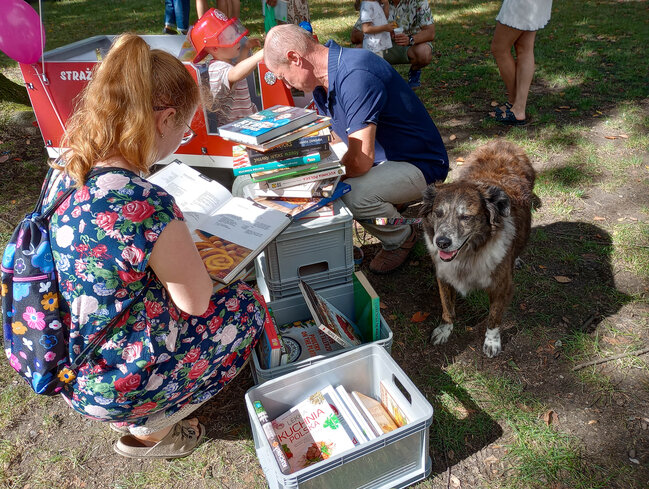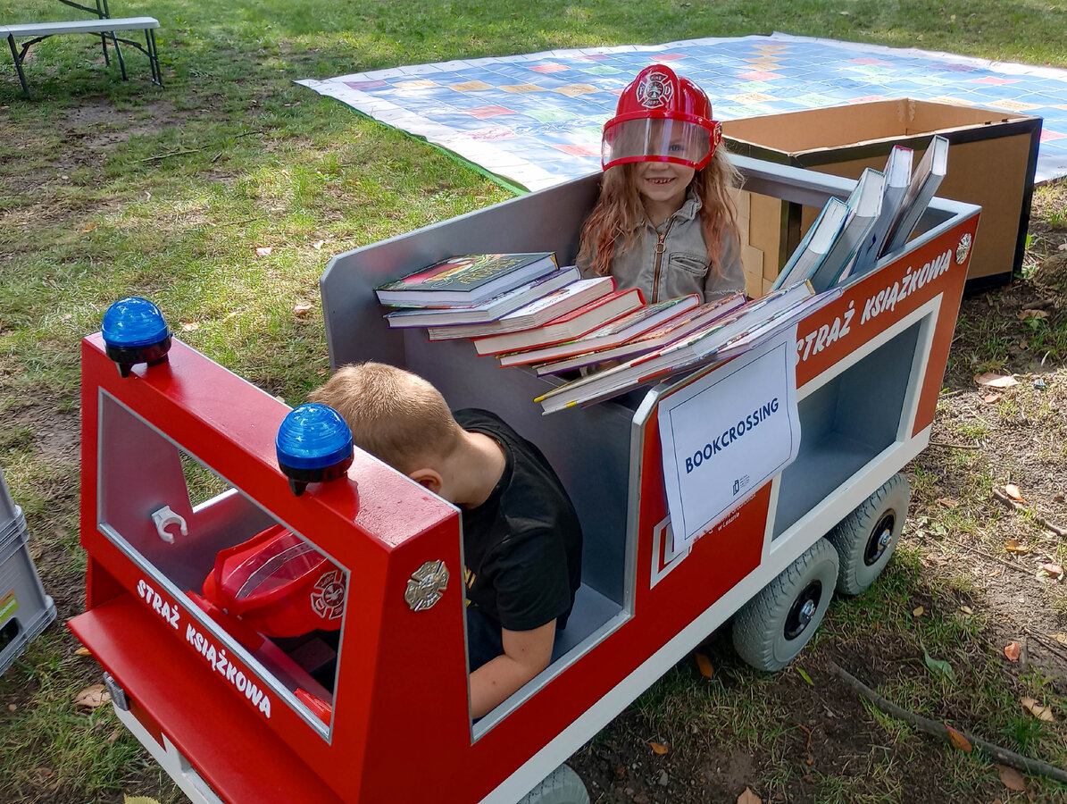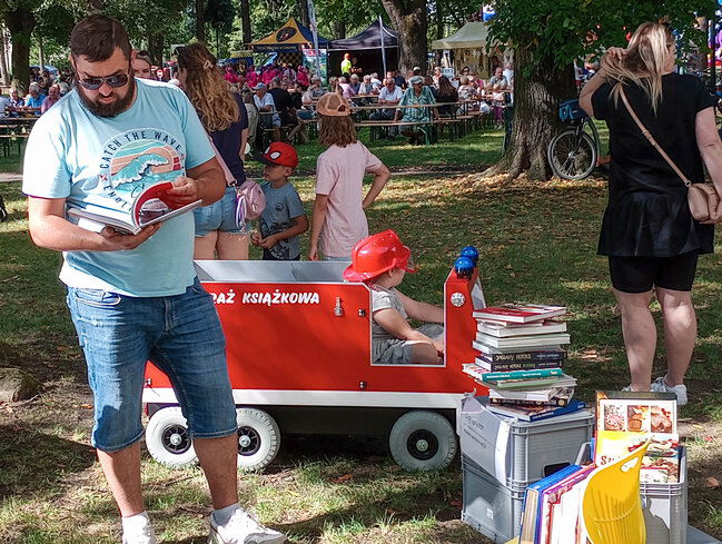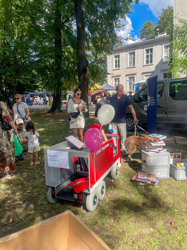 Nie zabrakło też słynnej Straży Książkowej – pojazdu bibliotecznego, który dostarczył książki w ramach bookcrossingu kulinarnego „Daj gryza, czyli smakowite historie”, a także był tłem do zdjęć i wielką frajdą dla dzieci.