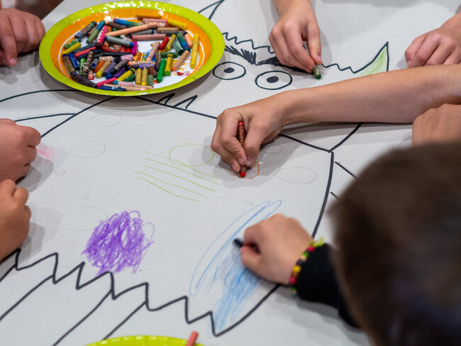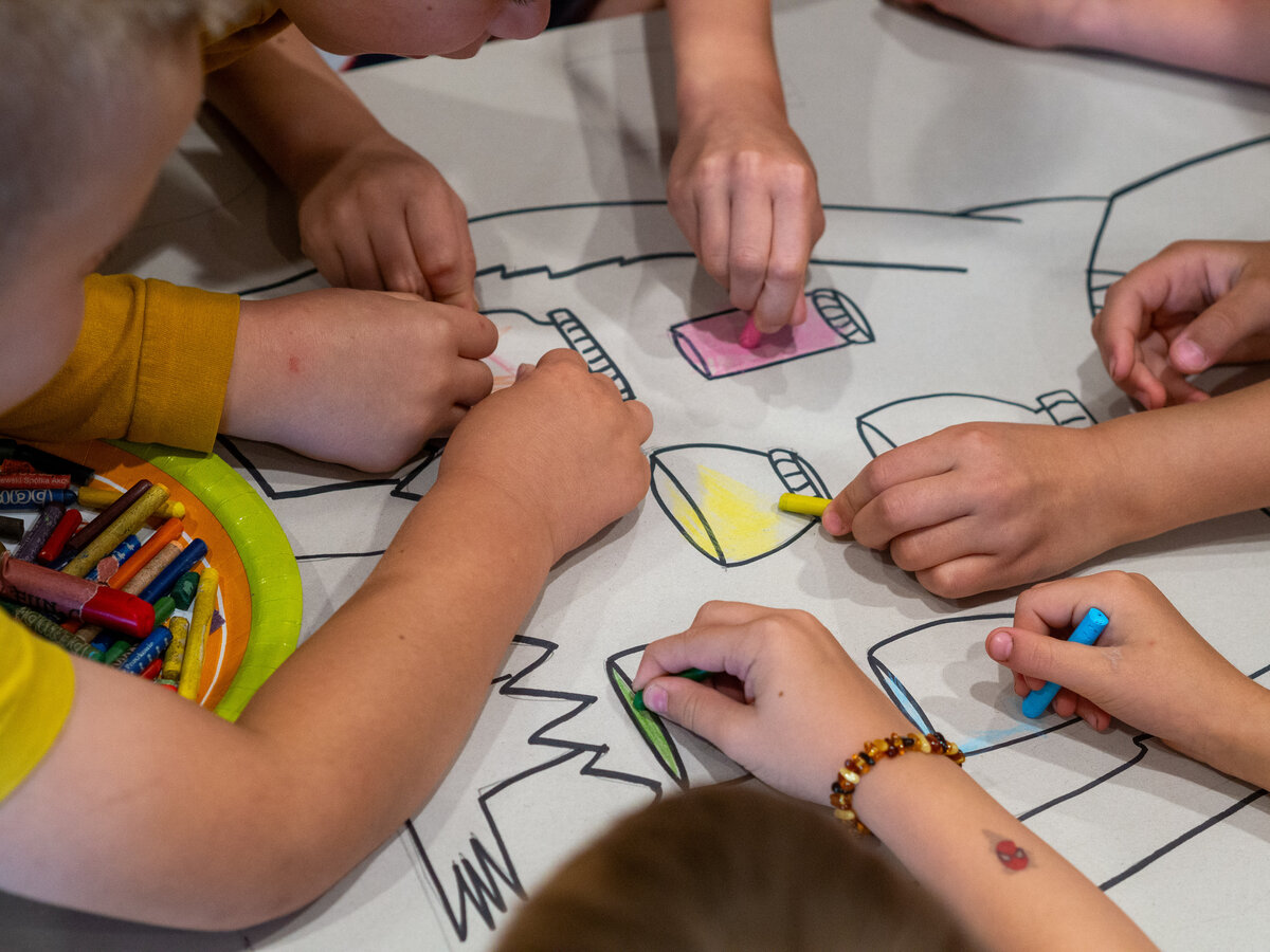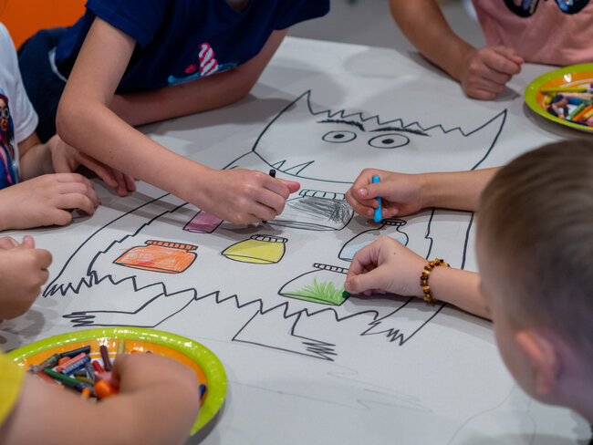 Natomiast druga grupa, grupa Jeżyków z Przedszkola Kraina Radości w Święciechowie, uczyła się o emocjach za pomocą książki „Kolorowy potwór”. Jest to prosta i zabawna historia, która wprowadzi dzieci w fascynujący język uczuć. Dzieci pomagały potworowi nazwać i uporządkować emocje w odpowiedzi słoiczki, podając przy tym przykłady, kiedy czuły dane emocje. Po posegregowaniu wszystkich uczuć przeszliśmy do sali plastycznej, gdzie dzieci miały za zadanie pokolorować trzy różne stany naszego potwora, od najbardziej kolorowego i niepoukładanego do szczęśliwego potwora z emocjami w podpisanych słoiczkach.