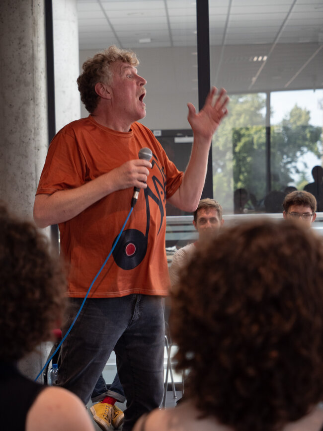 Następnie Hans Peter Salentin poprowadził zajęcia wokalne, tym razem bez trąbki. Pracując nad rytmiką, tonacjami i harmonią, uczestnicy stworzyli prawdziwie jazzowy chór.