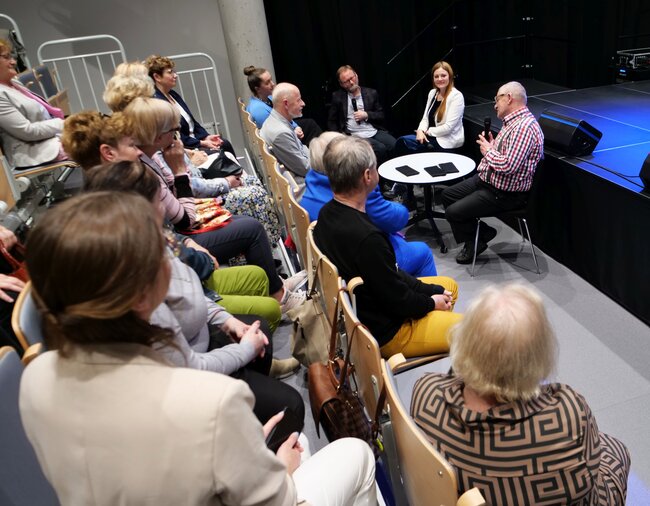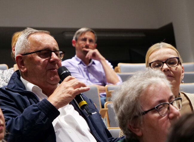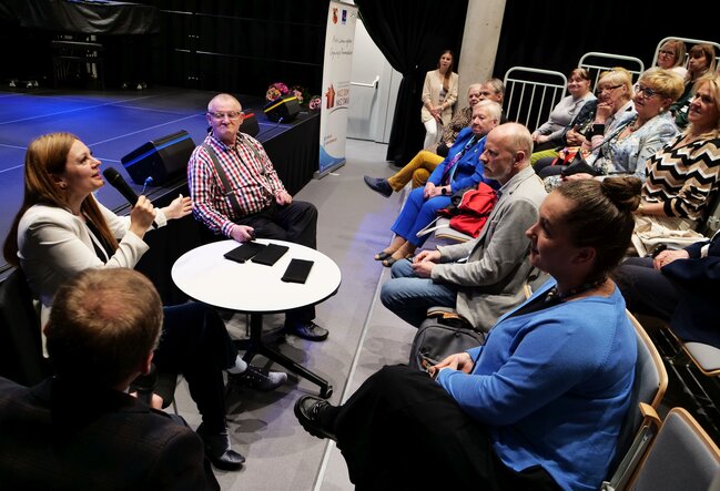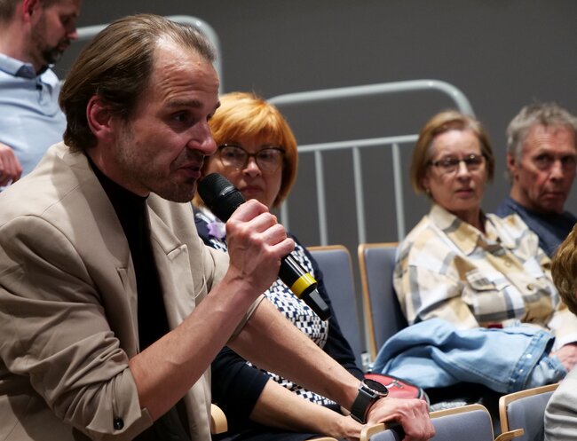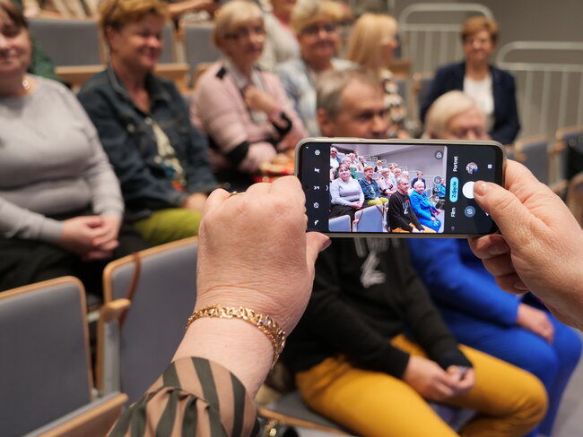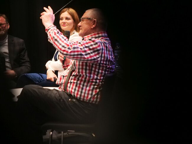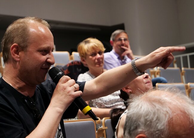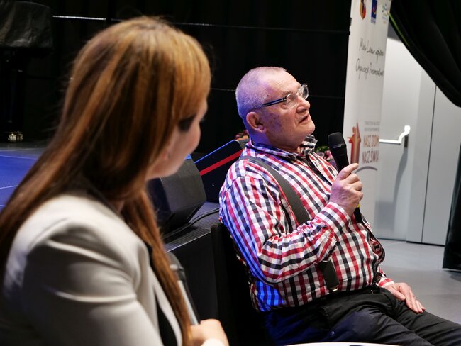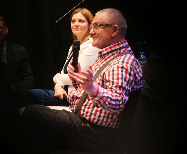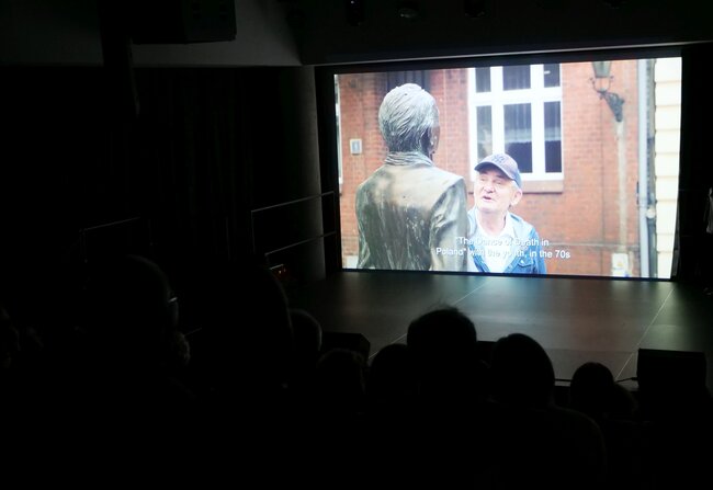 - Czy to dobrze że autorka filmu płacze na jego prezentacji? Przecież już tyle razy to widziałam - mówiła ocierając łzy Brulińska, a sala wyjaśniła, że to z powodu niezwykle wrażliwego patrona Biblioteki. Stanisław Grochowiak w filmie też zagrał, a raczej jego pomnik na Placu Metziga. Golejewski kładąc kwiatek na jego metalowym bucie dziękował mu i Bibliotece jego imienia. Po projekcji dziękowano już jemu i reżyserce - za ważny film o wykluczeniu osób chorych i losie niezwykle wrażliwego artysty skazanego na samotność. Wzruszeń tego wieczoru było dużo. Na spotkaniu pojawili się wieloletni przyjaciele Golejewskiego ze szkół, sąsiedztwa, pociągu a także ludzie, dla których był przez lata zawodową inspiracją. Spotkanie z reżyserką i aktorem poprowadził profesor Uniwersytetu im. Adama Mickiewicza dr hab. Wojciech Otto jednocześnie prezes Stowarzyszenia na Rzecz Osób Niepełnosprawnych ,,NASZ DOM - NASZ ŚWIAT’’ - inicjatora tego niezwykłego wydarzenia.