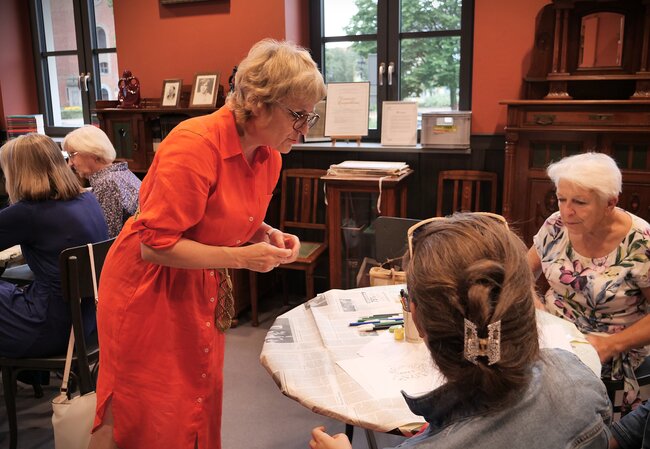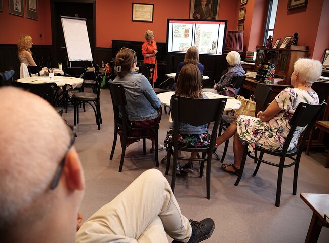[W bibliotece była Małgorzata Derwich. Opowiadała czytelnikom o swoim ojcu - Henryku Derwichu. Pokazywała jego rysunki. Na zdjęciach ona, jej goście.]