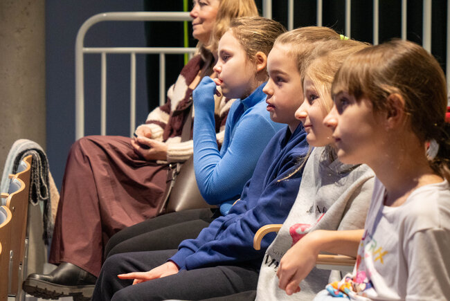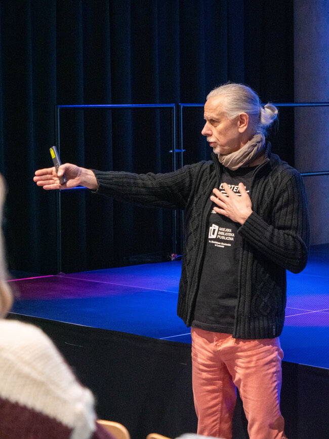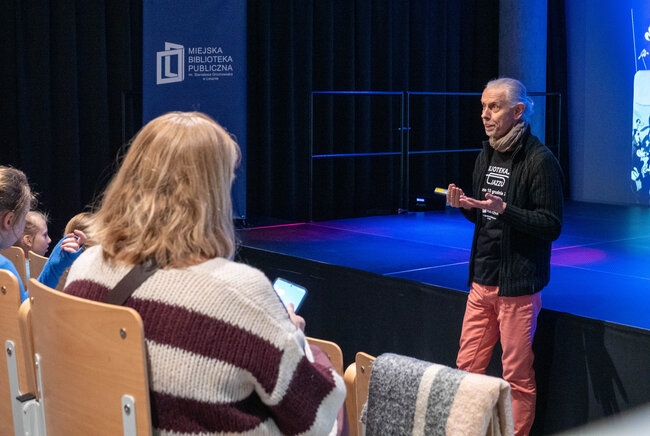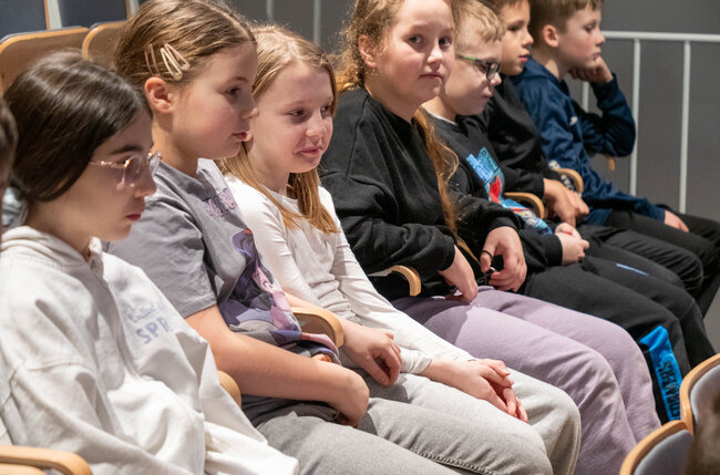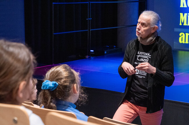 Andrzej Winiszewski poprowadził spotkanie w formie interaktywnej opowieści, łącząc prezentację instrumentów z anegdotami, przykładami brzmień i elementami wizualizacji dźwięków. Dzięki temu dzieci mogły nie tylko usłyszeć, ale też „zobaczyć”, jak muzyka się buduje i zmienia.