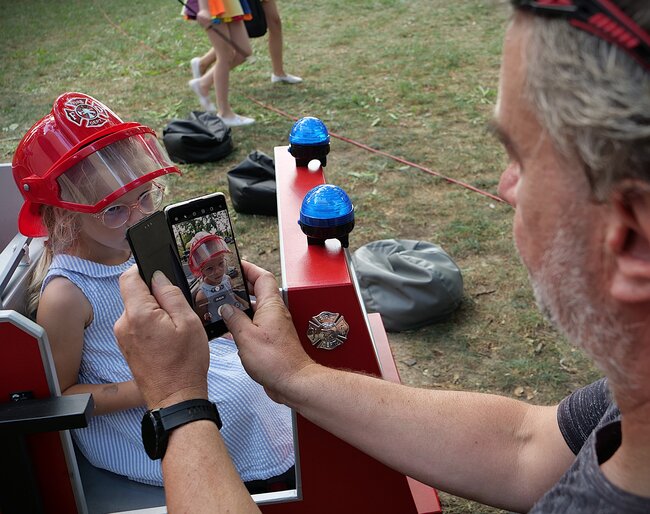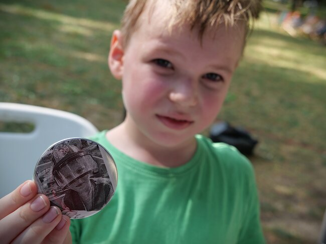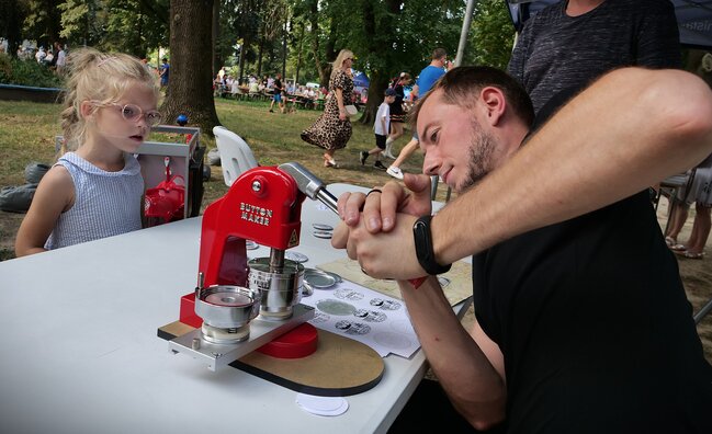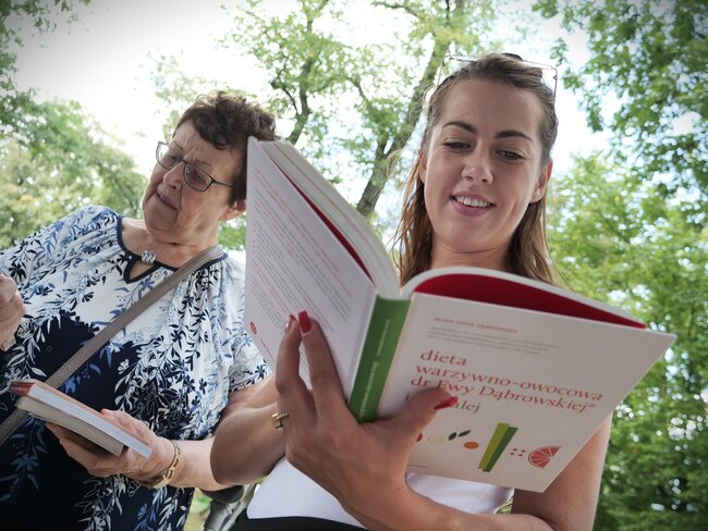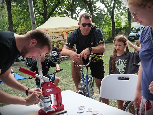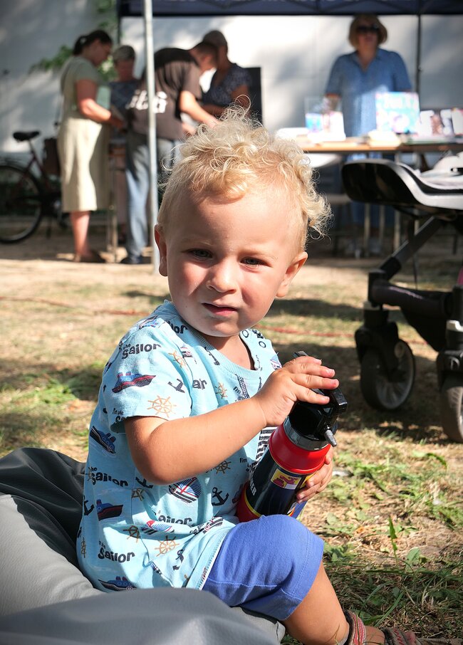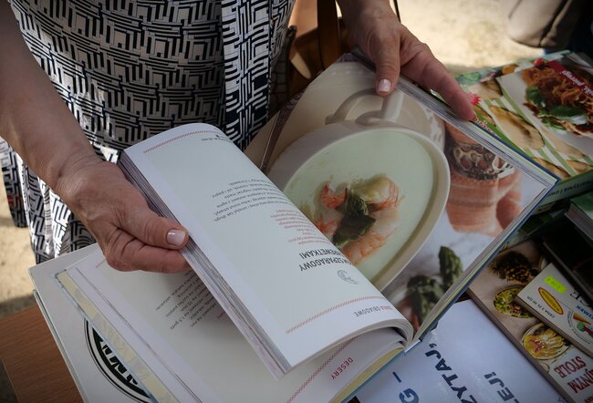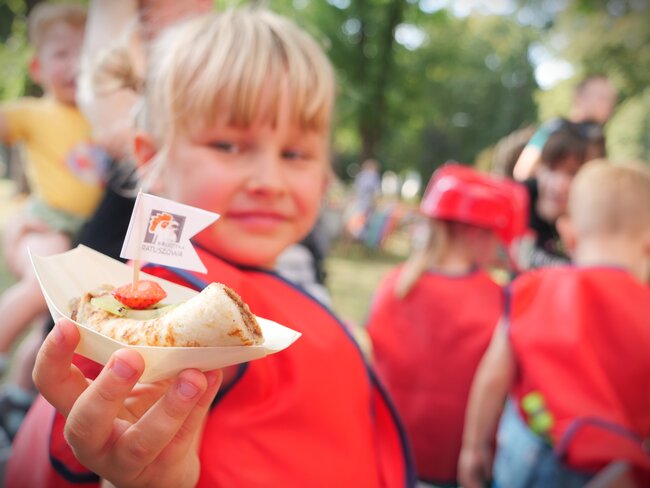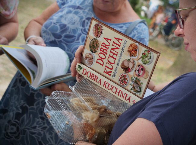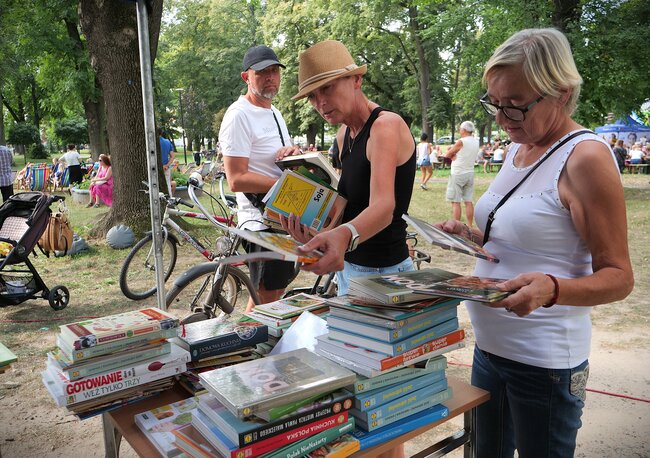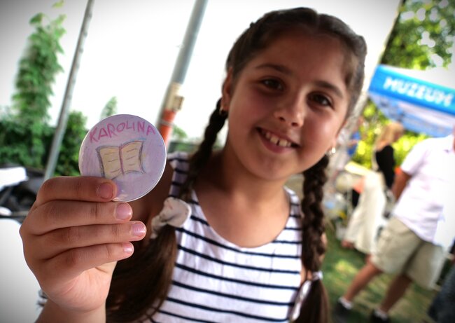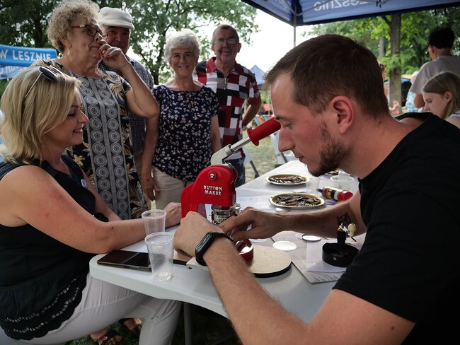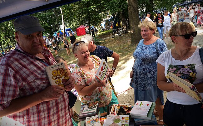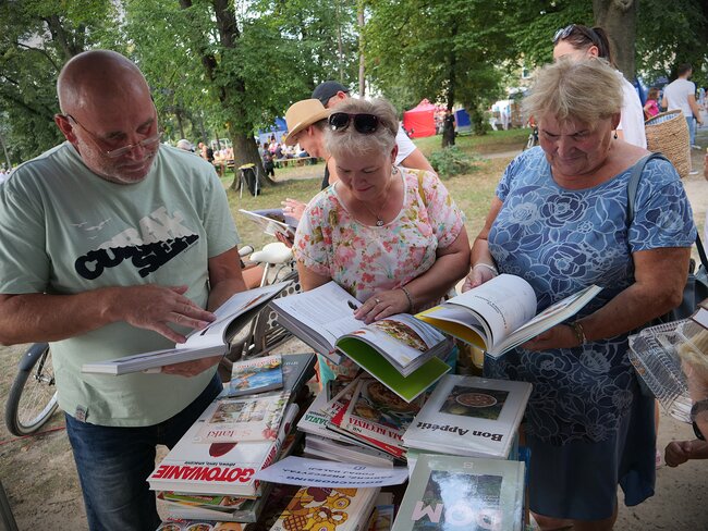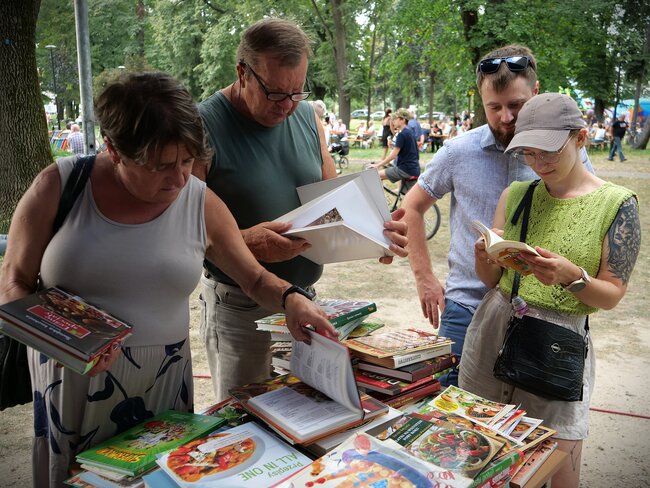 Dwa lata Piknik psuła pogoda. W tym roku na szczęście słońce w Parku Satyryków wprost rozpieszczało mieszkańców Leszna. My też rozpieszczaliśmy. Nasze stoisko bookcrossingu kulinarnego cieszyło się ogromnym zainteresowaniem, dzieci chętnie zaglądały do rozstawionej w parku wypożyczalni i nawet zdobyliśmy kilku nowych czytelników. Można było u nas własnoręcznie narysować sobie wzór na przypinkę lub stanąć do zdjęcia i dumnie spacerować po Lesznie z przypiętym do koszulki swoim zdjęciem. Niesłabnącym zainteresowaniem wśród dzieci cieszyła się też Straż książkowa. Nasz wóz strażacki służący do rozbudzania chęci do czytania - zafascynował kilkulatków. Ile akcji ratowniczych z nim wykonano i ile zdjęć, nie zliczymy. Dzielnych strażaków, by mieli siły do gaszenia pożarów, częstowaliśmy nawet strażackimi naleśnikami. Jednym słowem było ogniście.