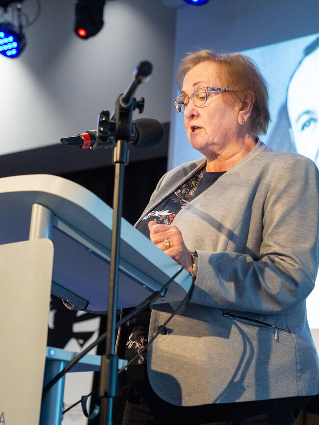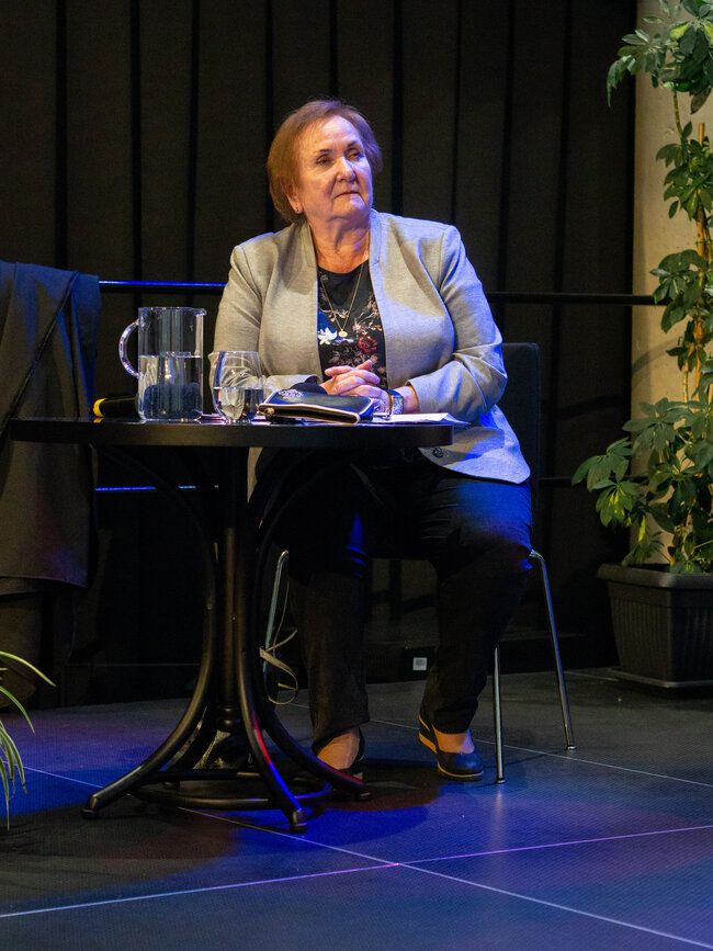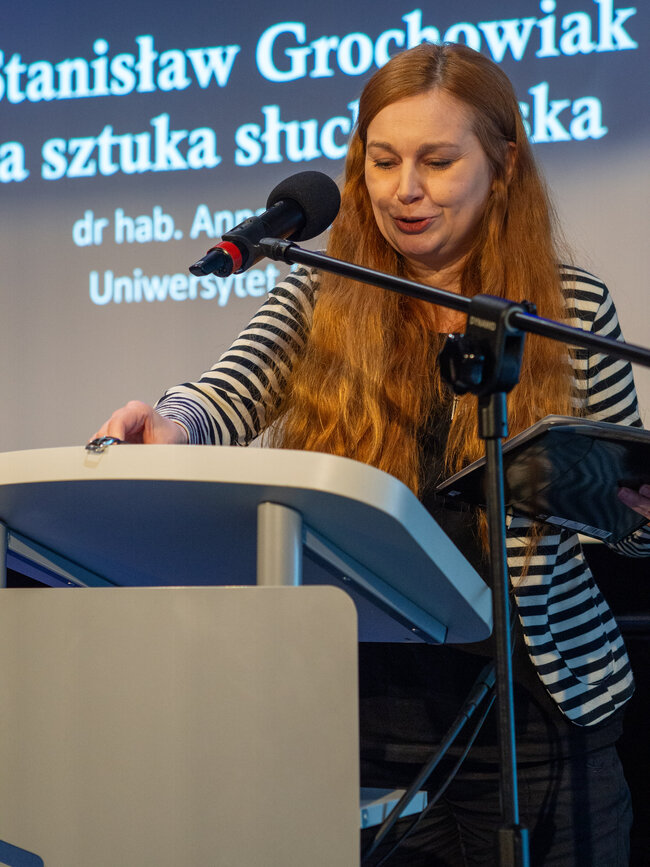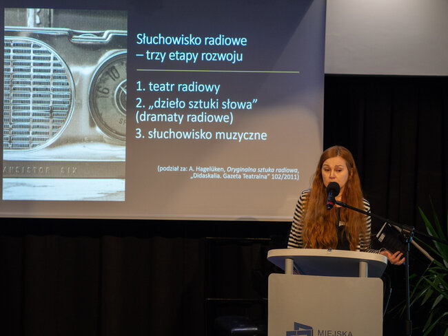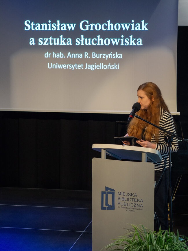 Następnie przyszedł czas na prezentację dr hab. Anny R. Burzyńskiej pt.: „Stanisław Grochowiak a sztuka słuchowiska”. W tej części wydarzenia mówczyni, dr. Hab nauk humanistycznych, krytyk teatralny oraz wykładowczyni na Uniwersytecie Jagiellońskim w Krakowie przybliżyła nam formę dramatu jaką jest słuchowisko, czyli dramat radiowy, teatr dla niewidomych, czy teatr wyobraźni. Ta forma sztuki zrodziła się już w latach 20 XX wieku, kiedy to wyszły na świat potrzeby żołnierzy i cywili poszkodowanych do I WŚ. Stanisław Grochowiak w swojej karierze dorósł do umiłowania tej formy sztuki, łącząc prozę, epikę i dramat w jeden przepiękny twór, który w pełni nadawał się do odtwarzania w radiu, a jego sztuki do dziś uznawane są za jedne z najlepszych w tej dziedzinie. W radiu ukazały się m. In. Utwory „Księżyc”, „Wergili” i „Z głębokiej otchłani wołam” autorstwa Grochowiaka. Dr Anna Burzyńska udostępniła nam do przeczytania fragmenty tych dramatów.