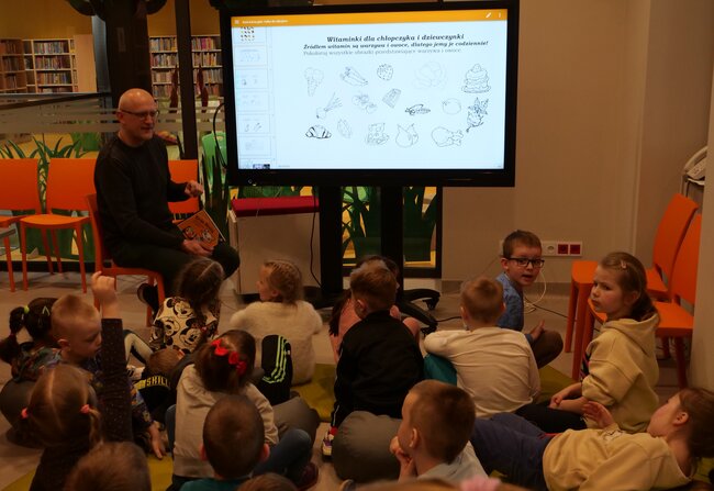 Tego dnia królowała ulubiona bohaterka kilkulatków - ,,Kicia Kocia’’. Tym razem czytano:,,Kicia Kocia i witaminowe przyjęcie’’. Maluchy zaangażowały się w rozmowy o zdrowiu, witaminach, sadzeniu warzyw i zbieraniu owoców a nawet o gotowaniu. Z zapałem pokolorowały kwiaty jabłoni, a potem z pomocą prowadzącego zajęcia - bibliotekarza Piotra Wiszniewskiego - wszystkie kwiatki zawisły na tekturowym drzewie w holu. Pod kwitnącą jabłonią przedszkolaki zapozowały do zdjęcia, a na pożegnanie wszyscy życzyli sobie już kwiatów na wszystkich drzewach, nie tylko tych bibliotecznych. Zajęcia odbyły się w ramach projektu ,,Z książką za pan brat’'.