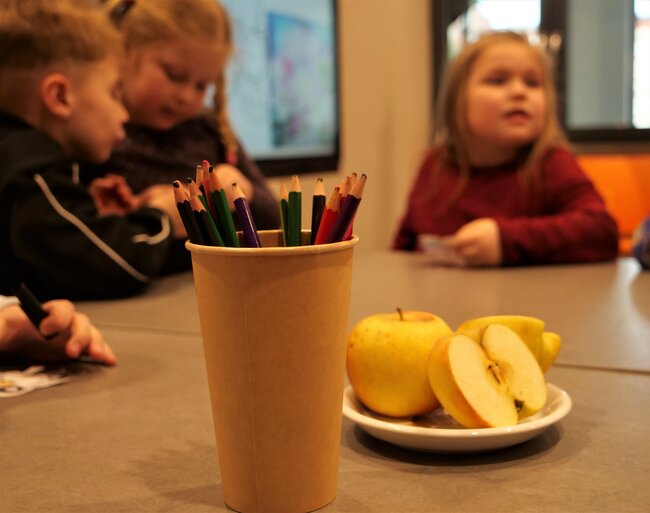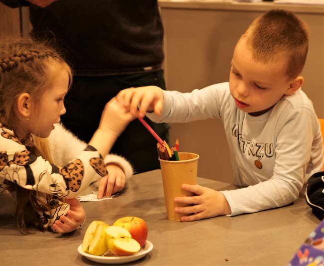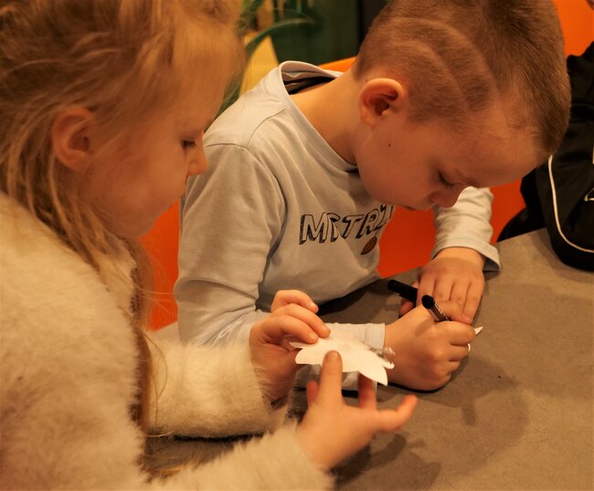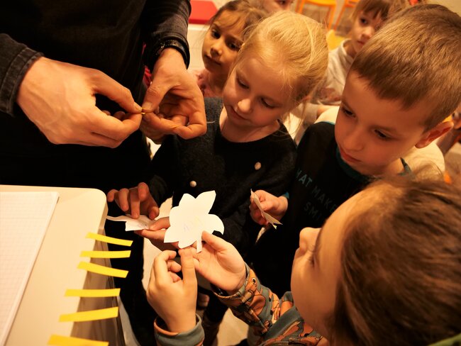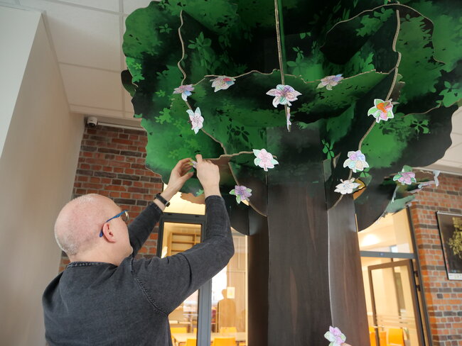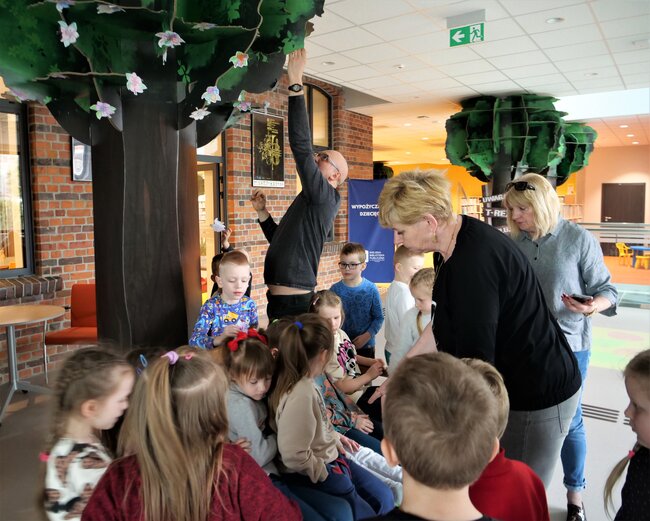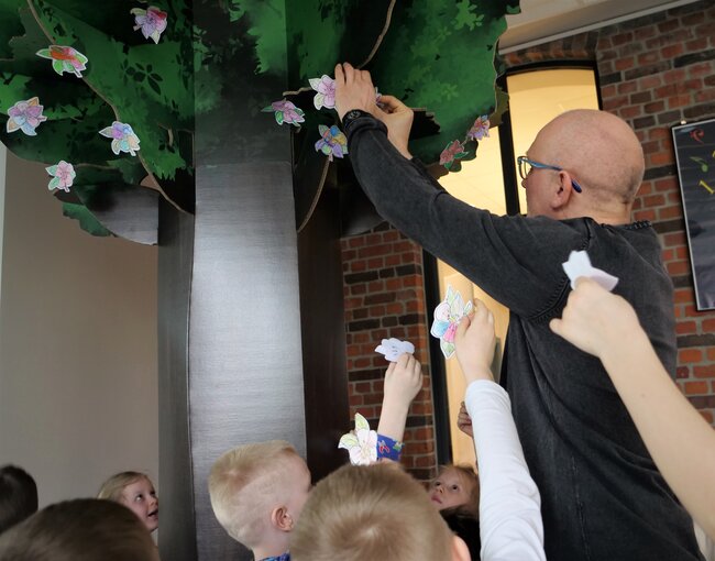 W holu przed wypożyczalnią dla dzieci w Leszczyńskiej Galerii Książki (Biblioteka przy Pl.Jana Metziga 25) zakwitła dziś (23 marca 2023) jabłoń. Tekturowe drzewo kwiatami udekorowały grupy Misiów i Skrzatów z Przedszkola Miejskiego numer 11 w Lesznie.