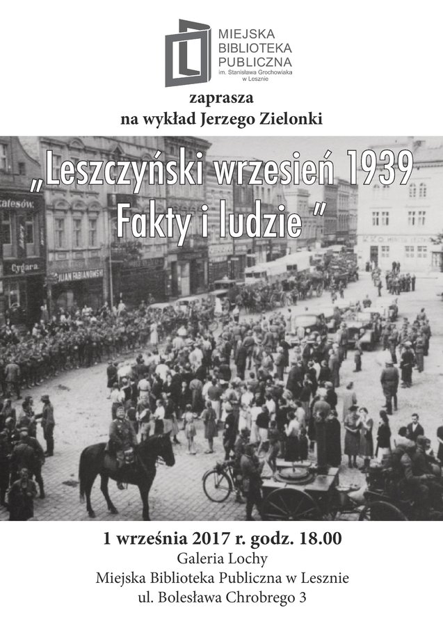 Wykład będzie miał miejsce w Galerii Lochy MBP w Lesznie 1 września 2017 r. o godz. 18.00. Prelekcja będzie dotyczyła przede wszystkim tego, co działo się w Lesznie i okolicy w pierwszych dniach września 1939 r. Redaktor Zielonka opowie także o wynikach najnowszych badań dotyczących historii Leszna z lat 1939-1945.