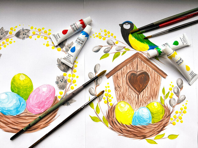 Uczestnicy warsztatów rysunku artystycznego, prowadzonych przez Annę Rykovą wykonali farbami gwasz rysunki ze świątecznymi motywami. Pisanki, bazie oraz rozmaite symbole budzącej się do życia wiosny - wyobraźnia naszych uzdolnionych Czytelników działała na najwyższych obrotach. Niedziela w bibliotece upłynęła w relaksującej, artystycznej atmosferze. Malowali zarówno dorośli, jak i dzieci w dwóch odrębnych grupach. Kolejne zajęcia tym razem przeznaczone tylko dla najmłodszych (6-12 lat), odbędą się w środę 29 marca o godz. 16:00 w Leszczyńskiej Galerii Książki (Biblioteka przy pl. Jana Metziga 25). Zapraszamy!