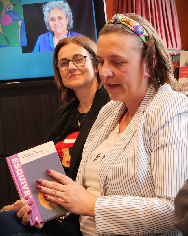 Katarzyna Ziarczyk lektorka hiszpańskiego ze szkoły Językowej ADJ w Lesznie zaprosiła zebranych do świata z książki, która urzekła ją wiele lat temu i została z nią do dziś - ,,Przepiórki w płatkach róży’’ Laury Esquivel. To najbardziej znana powieść meksykańskiej literatury, która sprzedała się już w ponad 3 milionach egzemplarzy i którą przetłumaczono na kilkadziesiąt języków. Rzecz o niespełnionej miłości, którą bohaterka wyraża w gotowaniu. Zmysłowa, ze smakami, zapachami i przepisami (przepis otwiera każdy rozdział), ale jednocześnie przepiękna w warstwie słownej. Powieść o walce o marzenia.