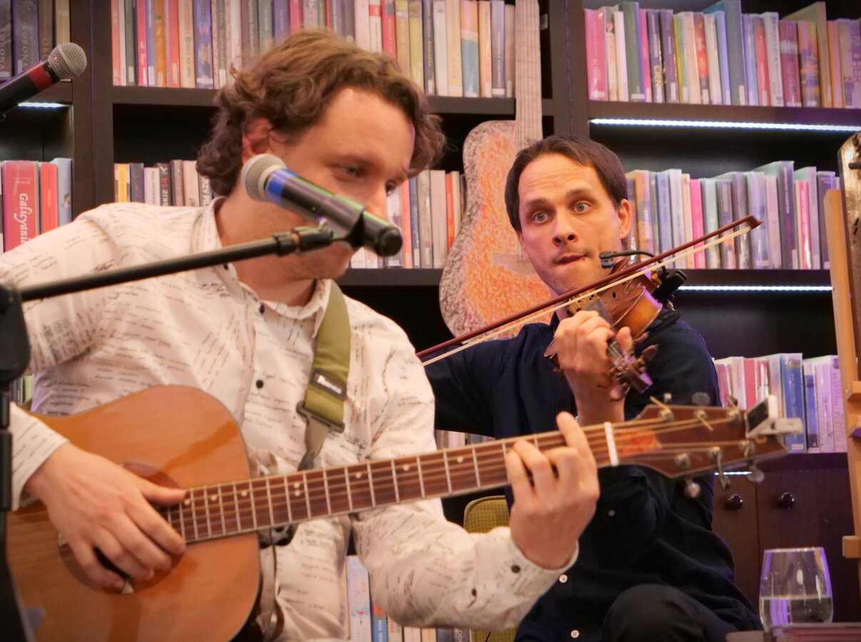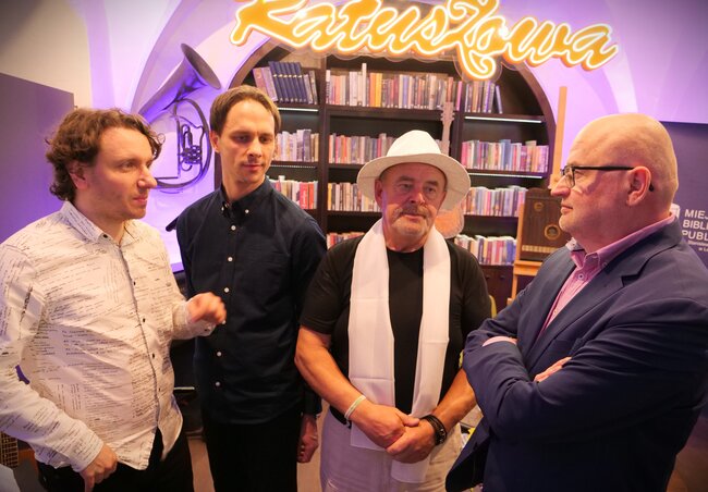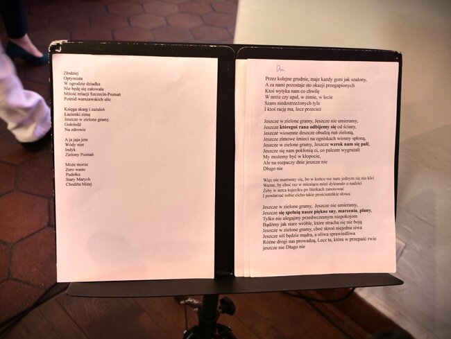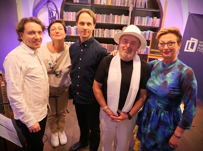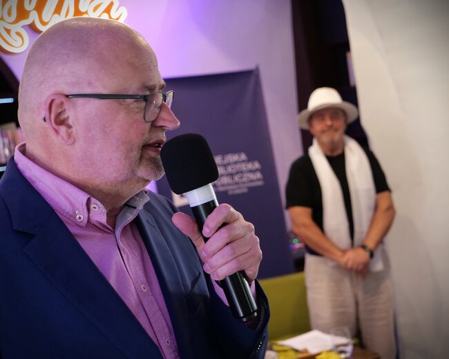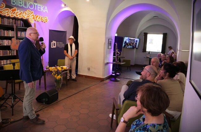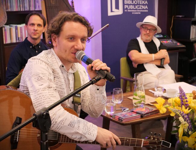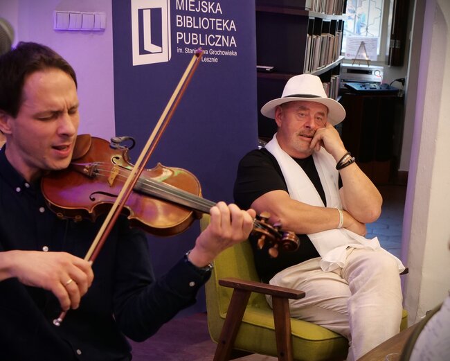 Na scenie wystąpił w koszuli z nadrukiem wykonanym z rękopisów Wisławy Szymborskiej, ale wcale nie dlatego był to wieczór poetycki. Każda pogadanka z Roszakiem bowiem kończyła się jedną z fantastycznych piosenek między innymi z repertuaru Klubu Szyderców Bis. Był ogień, szczególnie, że na urokliwej scenie Biblioteki Ratuszowej gwiazda wieczoru pojawiła się ze wsparciem - skrzypkiem Szymonem Żurowski. Mazurek śpiewał elegancką polszczyzną, gwarą, językiem potocznym. Opowiadał o swoich mistrzach (Wasowski, Przybora, Młynarski, Osiecka, Kaczmarski) których wpływ słychać było w jego tekstach, o tym jak zaczynał karierę (w Domu Kultury w Bojanowie) i nad jakimi projektami obecnie pracuje (nie ośmielimy się wymienić). Śpiewał zgrabnie o polityce, zwierzał się z diety (,,..a ja jaja jem…), że ,,Wódy niet’’ (jedyna piosenka Klubu z teledyskiem nakręconym zresztą w Lesznie - sic!) i z życiowych przygód. Ciekawie, dowcipnie, z klasą - jak w Kabarecie Starszych Panów - i pasją. Były konkursy dla publiczności, były nagrody, a jedna - płyta z piosenkami Klubu Szyderców Bis dzięki wspaniałomyślności damy, która ją wygrała, trafiła w ręce Andrzeja Kużmińskiego, dyrektora MBP. Będzie mogła sprawiać radość wszystkim czytelnikom.