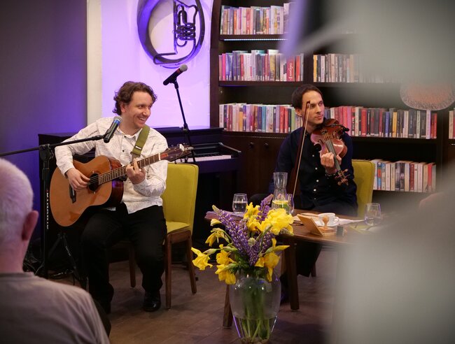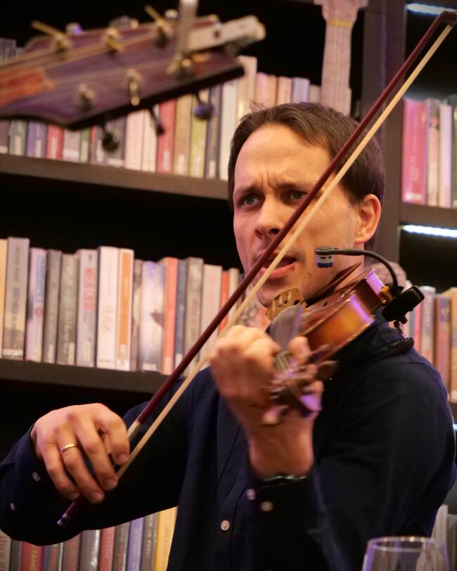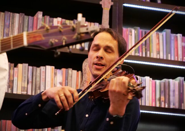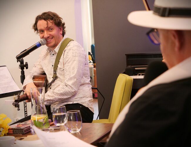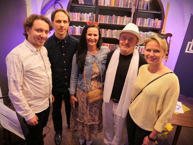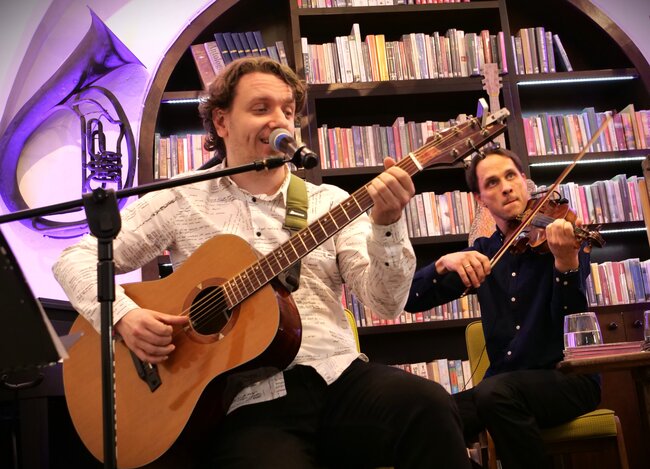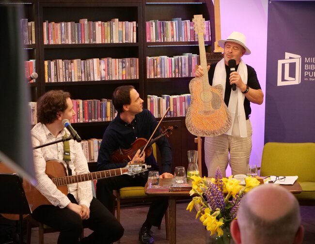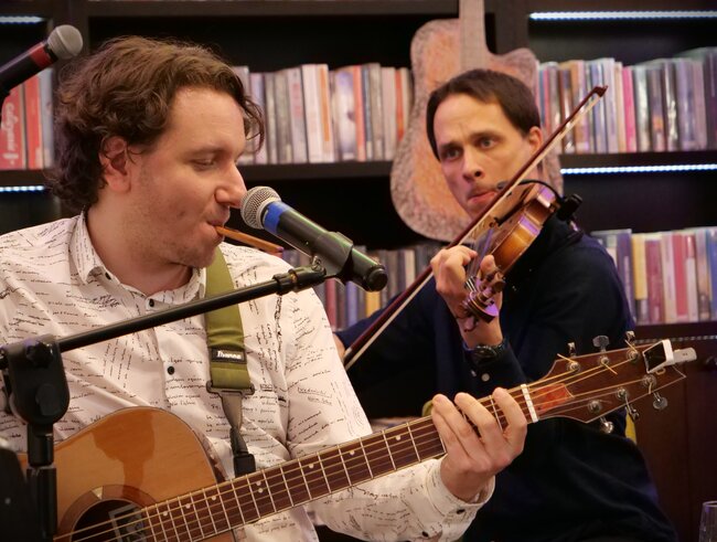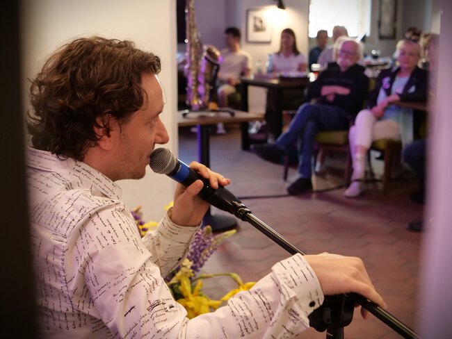 Na scenie wystąpił w koszuli z nadrukiem wykonanym z rękopisów Wisławy Szymborskiej, ale wcale nie dlatego był to wieczór poetycki. Każda pogadanka z Roszakiem bowiem kończyła się jedną z fantastycznych piosenek między innymi z repertuaru Klubu Szyderców Bis. Był ogień, szczególnie, że na urokliwej scenie Biblioteki Ratuszowej gwiazda wieczoru pojawiła się ze wsparciem - skrzypkiem Szymonem Żurowski. Mazurek śpiewał elegancką polszczyzną, gwarą, językiem potocznym. Opowiadał o swoich mistrzach (Wasowski, Przybora, Młynarski, Osiecka, Kaczmarski) których wpływ słychać było w jego tekstach, o tym jak zaczynał karierę (w Domu Kultury w Bojanowie) i nad jakimi projektami obecnie pracuje (nie ośmielimy się wymienić). Śpiewał zgrabnie o polityce, zwierzał się z diety (,,..a ja jaja jem…), że ,,Wódy niet’’ (jedyna piosenka Klubu z teledyskiem nakręconym zresztą w Lesznie - sic!) i z życiowych przygód. Ciekawie, dowcipnie, z klasą - jak w Kabarecie Starszych Panów - i pasją. Były konkursy dla publiczności, były nagrody, a jedna - płyta z piosenkami Klubu Szyderców Bis dzięki wspaniałomyślności damy, która ją wygrała, trafiła w ręce Andrzeja Kużmińskiego, dyrektora MBP. Będzie mogła sprawiać radość wszystkim czytelnikom.
