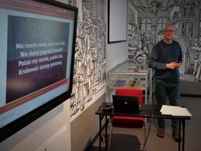 O liczącej około osiemset lat historii ,,Bogurodzicy’’, ,,Pieśni Legionów Polskich we Włoszech’’ i niezwykłym wpływie ,,Roty’’na Polaków w piątek, 19 maja, opowiadał Paweł Wiszniewski, bibliotekarz historyk. Zajęcia pt.: ,, Hymn i polskie pieśni narodowe… ’’ odbyły się w sali Muzeum Drukarstwa Leszczyńskiej Galerii Książki (pl. Jana Metziga 25).