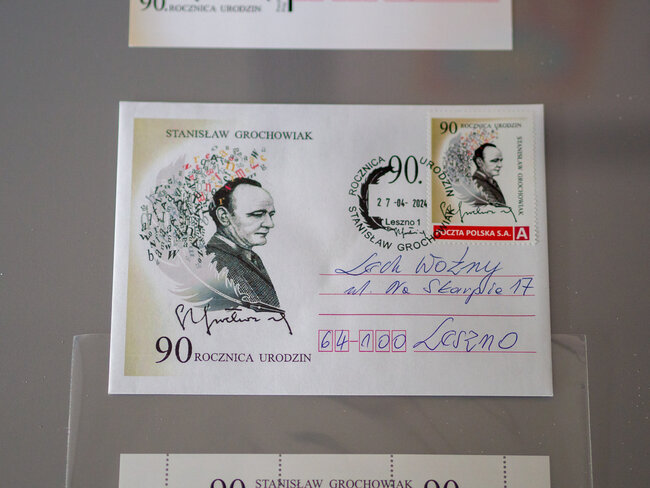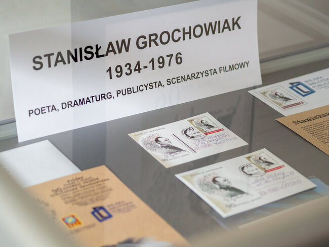 Ekspozycja znajduje się w Pasażu Kultury na parterze LGK. W czterech gablotach ukazano bogactwo materiałów filatelistycznych, zebranych na przestrzeni wielu lat, w układzie chronologicznym. Jedna z gablot poświęcona jest Stanisławowi Grochowiakowi, patronowi biblioteki. Można w niej zobaczyć znaczek pocztowy wydany przez Polski Związek Filatelistów, przedstawiający podobiznę poety. Autorem projektu są Lech Woźny oraz Wojciech Akuszewski. Znaczek ten został wydany z okazji 90. rocznicy urodzin Grochowiaka. W gablocie znajdują się także karta pocztowa oraz folder filatelistyczny, również zaprojektowane przez Akuszewskiego.