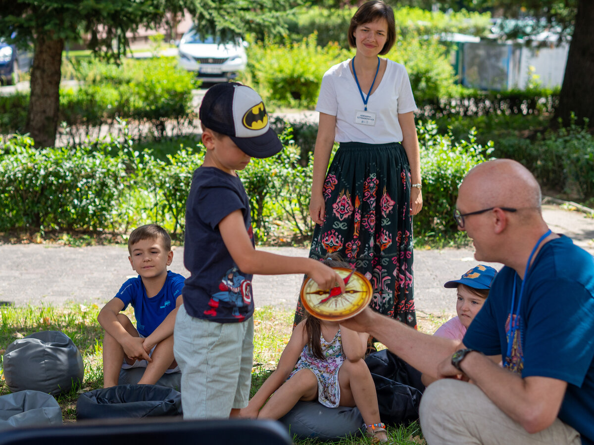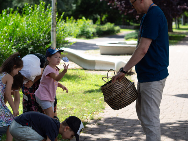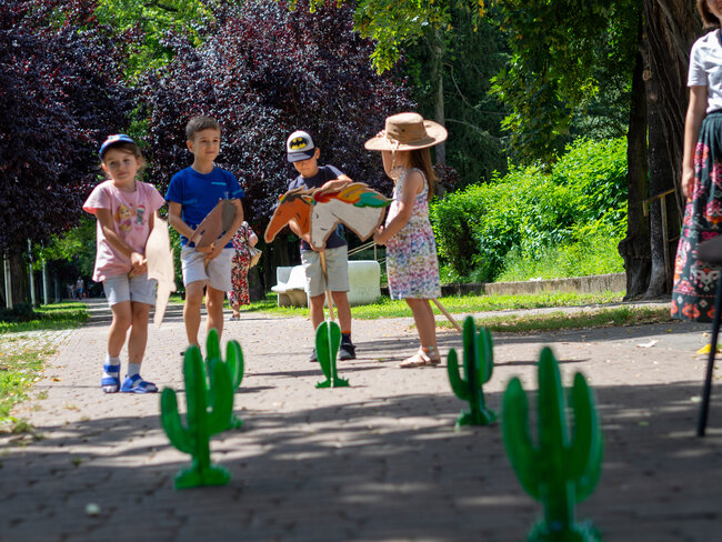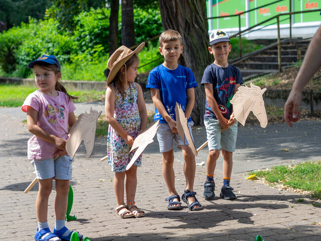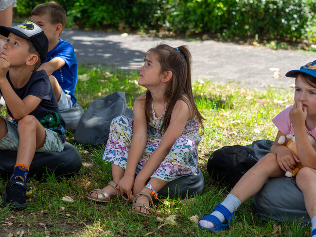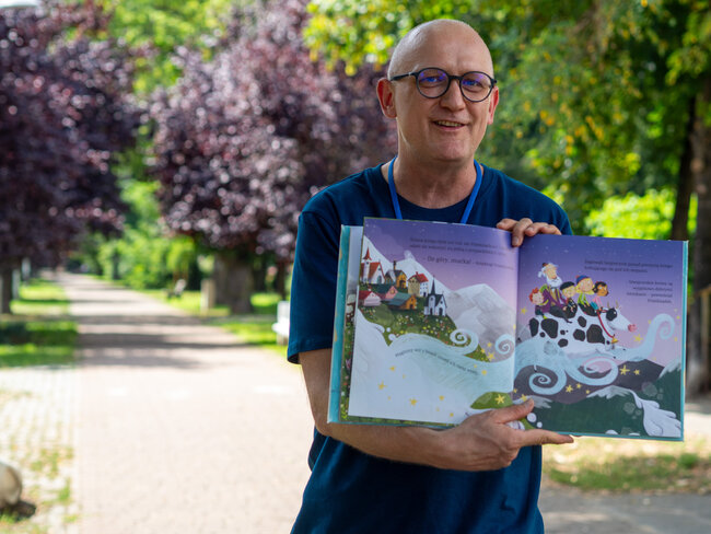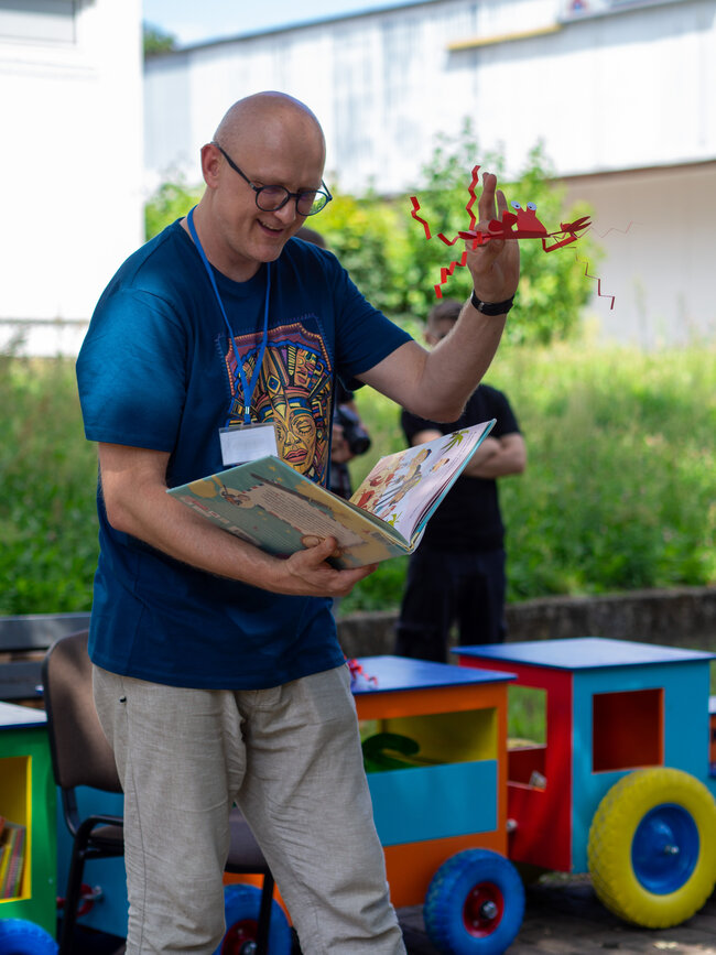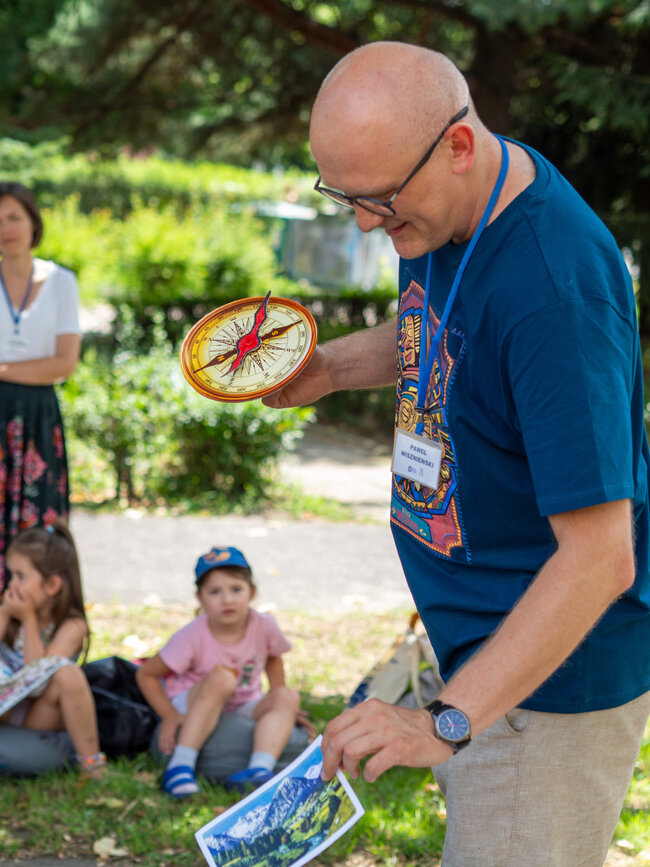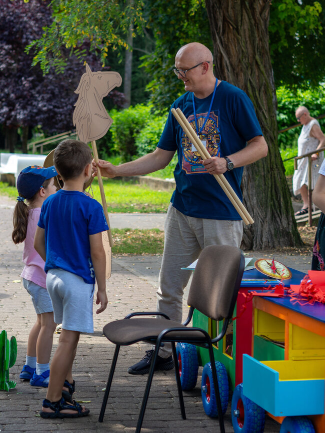 Pogoda była tak wspaniała, że rozłożyliśmy poduchy i Bajkomotywę w parku, w cieniu drzew. Wraz z naszym bibliotecznym skrzatem Stefkiem czekaliśmy z niecierpliwością na pierwszych małych czytelników. I jak zwykle, nie zawiedliście nas! Powoli zaczęliśmy snuć opowieści z książki „Hej, Przedziadku!” Paula McCartneya, czyli jednego z najbardziej znanych ludzi na ziemi - członka zespołu The Beatles (choć nasi mali słuchacze pewnie go nie kojarzą). Dzięki magicznej busoli przenieśliśmy się nad morze, gdzie kraby szczypały nas w palce (tak, rodziców też!), a potem ruszyliśmy na prerie Dzikiego Zachodu, jeździliśmy na dzikich mustangach, unikając przy tym kłujących kaktusów i uciekając przed galopujacymi bizonami. Następnie magiczna busola Przedziadka przeniosła nas w Alpy, gdzie wreszcie mogliśmy odpocząć od upału. Ale nie na długo! Złapała nas lawina śnieżna i musieliśmy uciekać co sił w nogach! Na szczęście uratowała nas latająca alpejska krowa (zdaniem Przedziadka są one wspaniałymi lotnikami. Kto by pomyślał!). Po takiej pełnej wrażeń wycieczce Ancymony padły ze zmęczenia i musieliśmy zakończyć naszą przygodę na dziś.