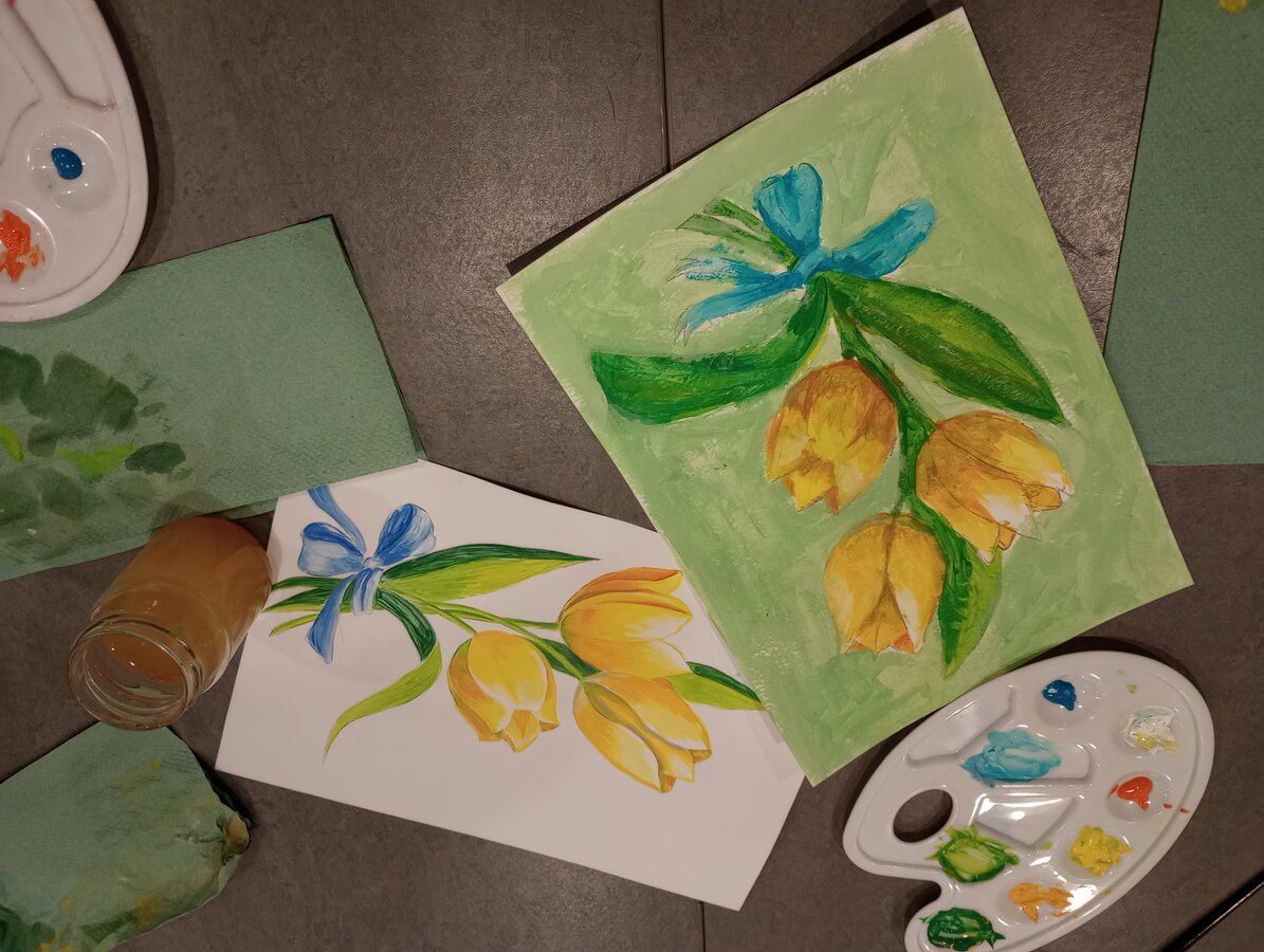 Malowanie rozpoczęło się od początkowo niepewnych i delikatnych kresek, by przejść do zamaszystych, pozornie bezkształtnych plam, które chwile później okazały się być tulipanami. Całą magię tworzyło malowanie warstwami, etapami i budowanie głębi. I chociaż wszyscy malowali to samo, to jednak każdy inaczej.