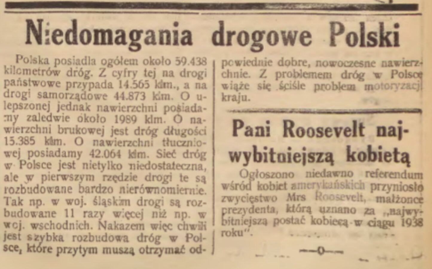 W artykule „Niedomagania drogowe Polski” z 15 lutego 1939 roku redaktorzy „GL” tak streszczają ówczesną kondycję polskich dróg (pisownia oryginalna):