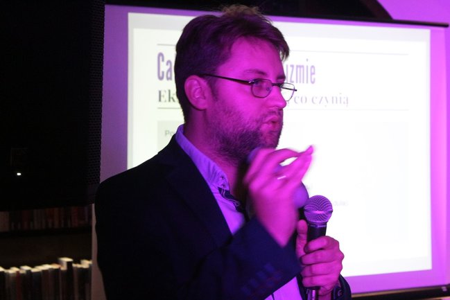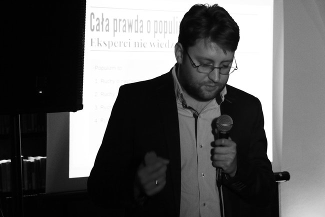 Temat spotkania pt. "Populizm - zmora czy błogosławieństwo demokracji" przedstawił p. Piotr Andzejewski, który jest asystentem naukowym w Instytucie Studiów nad Niemcami. Zajmuje się ruchami radykalnie prawicowymi, populizmem oraz polityką państw niemieckojęzycznych (Niemcy, Austria, Szwajcaria).
