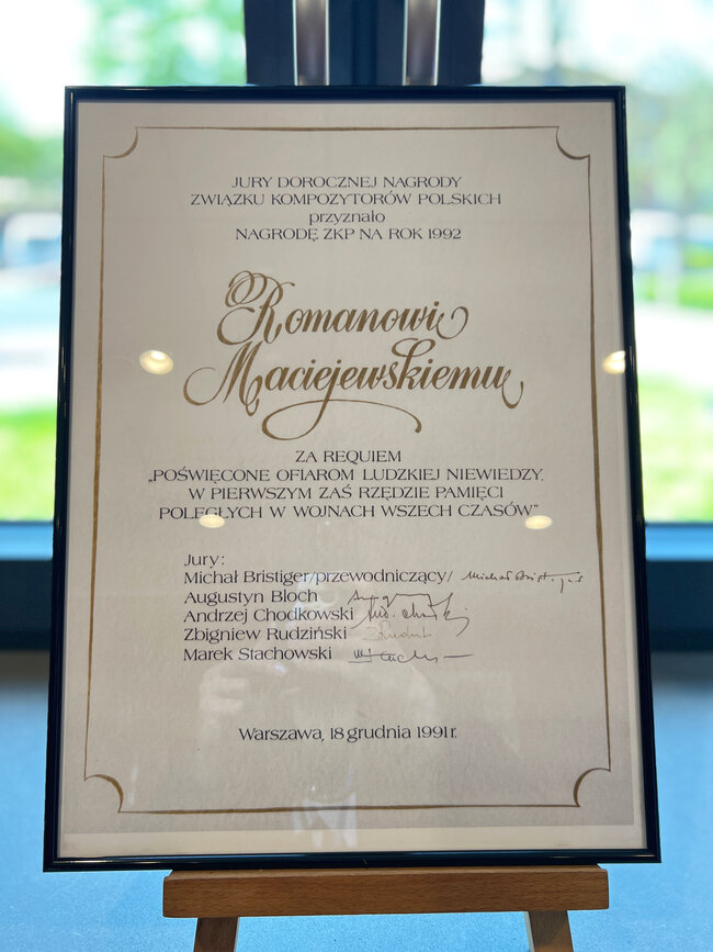 Roman Maciejewski (ur. 28 lutego 1910 w Berlinie, zm. 30 kwietnia 1998 w Göteborgu). W Lesznie spędził dzieciństwo, czas gimnazjalny (Państwowe Gimnazjum Męskie im. Jana Amosa Komeńskiego) i wakacje w trakcie studiów. Był najmłodszym organistą w historii kościoła farnego pod wezwaniem św. Mikołaja. Zdarzało mu się tam - jak sam opowiadał - wykonywać na organach dzikie improwizacje ,,wywołujące popłoch wśród parafian i zmuszające do częstego przerywania mszy’’ (za Marleną Wieczorek: „Roman Maciejewski kompozytor pokolenia zgubionego’’ – w zasobach MBP). Muzycznie kształcił się w konserwatoriach w Berlinie, Poznaniu i Warszawie. W 1934 roku wyjechał na stypendium do Paryża. Od 1938 do 1939 mieszkał w Wielkiej Brytanii, potem w Szwecji (do 1951). W Stanach Zjednoczonych (na zaproszenie Artura Rubinsteina) był do 1977. Wrócił do Szwecji. Nie gonił za blichtrem. Ważniejsza była dla niego sama muzyka i jej przesłanie. Opus magnum swojego życia: „Missa pro defunctis (Requiem)” poświęcone ofiarom II wojny światowej pisał 15 lat. „To jest utwór poświęcony ofiarom ludzkiej niewiedzy. Wydaje mi się, że źródłem wszelkich niepowodzeń ludzkich, tragedii, niesprawiedliwości, zbrodni jest po prostu ignorancja, niewiedza o tym, czym człowiek jest, skąd przyszedł i dokąd idzie. Problem wojny np. jest jednym z następstw tej niewiedzy" - mówił w jednym z wywiadów radiowych.