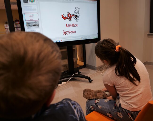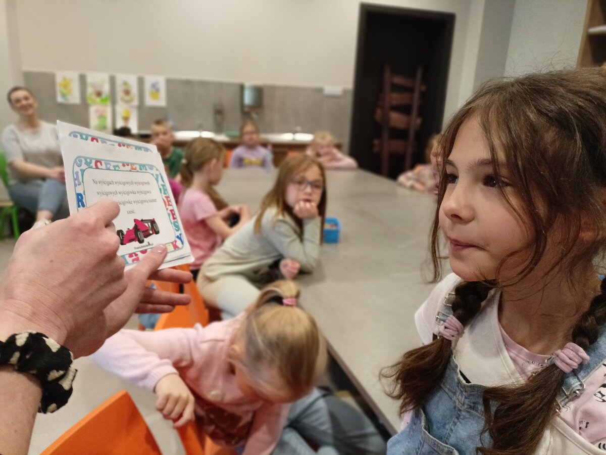 Dzieci obejrzały film edukacyjny ,,Z- jak zagadka’’, a potem wkroczyły razem z prowadzącą warsztaty Aleksandrą Zabłocką na grząski grunt językowych łamańców i najczęstszych błędów językowych. To była prawdziwa gimanstyka języka. Plątał się przy ,,stole z powyłamywanymi nogami’’, wierszyku o królowej Karolinie, wyścigach wyścigowych wyścigowych wyścigówek… czy Pocztmistrzu z Tczewa.