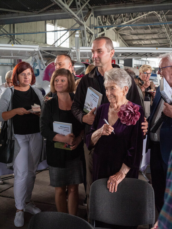 Ważnym punktem benefisu była jednak książka „Z głową w chmurach. Wspomnienia”. To właśnie wokół niej toczyła się rozmowa z Adelą Dankowską, która opowiadała o swoich początkach, pasji do latania, niezwykłych osiągnięciach oraz życiu prywatnym związanym z Lesznem. Drugie wydanie wspomnień, przygotowane przez Miejską Bibliotekę Publiczną im. Stanisława Grochowiaka, spotkało się z ogromnym zainteresowaniem uczestników wydarzenia.